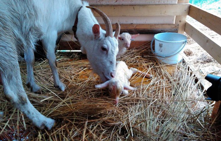 ヤギの出産はかなりするっと産まれるらしく、昨年豆太郎を出産した絹母さんも気がついたらヤギが増えていたような感じです。