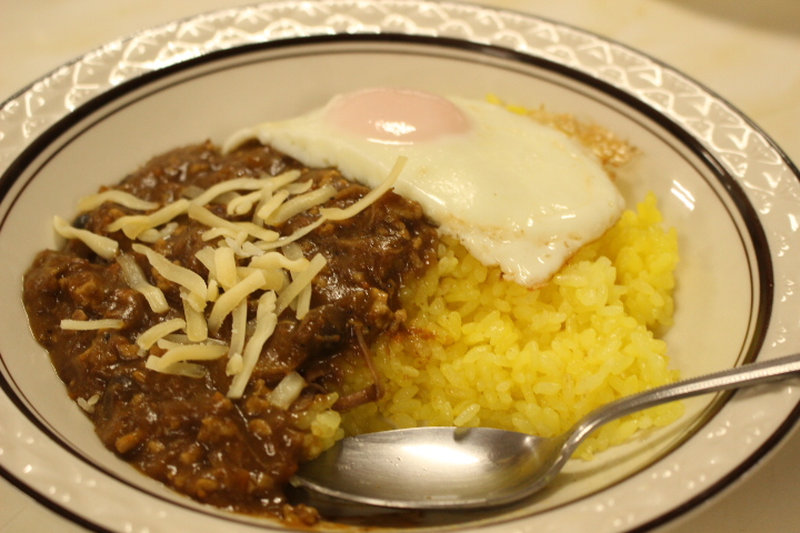 さて、問題のキーマカレー。ご飯はわざわざターメリックを入れて炊き込んであります。