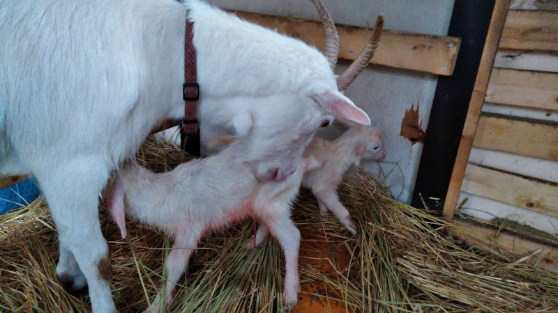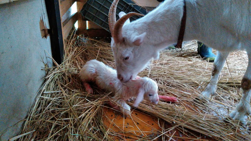 ヤギの出産はかなりするっと産まれるらしく、昨年豆太郎を出産した絹母さんも気がついたらヤギが増えていたような感じです。