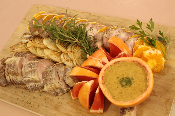 それから、コンパで作ってみたインスタ料理、ローストポークの柑橘風味とハニーマスタードソースです。昨年は揚げ物や淡水化物ばかりで「褐色ばんばん」とか「褐色祭り」とか散々馬鹿にされ、唇をかみ締める思いをさせられましたがしだしのオードブルとか始めて色々研究して、かなり綺麗な料理を作れるようになりました。