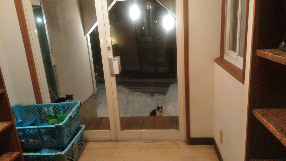 玄関で雪宿りするにゃんこ達も心なしか不安そう。普段は猫なんぞに感情移入しない私ですが、この日ばかりは猫にシンパシーを感じてしまいました。