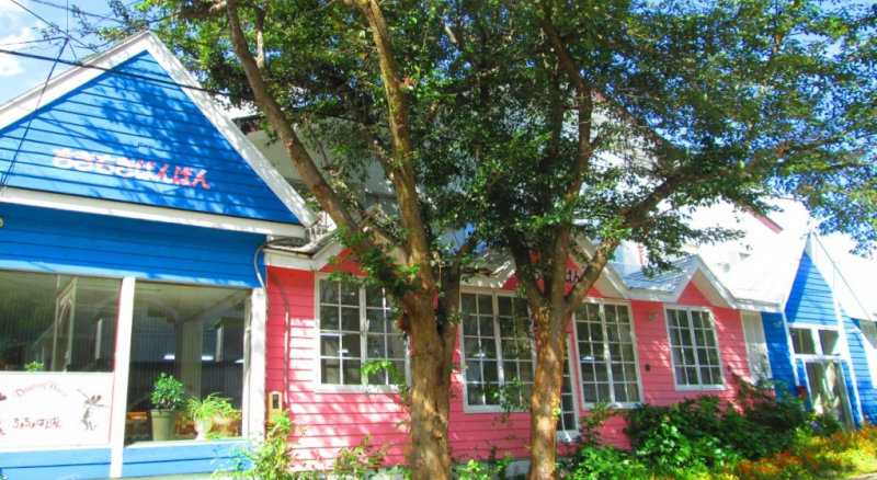 北信州、木島平村の森の奥。急峻な上り坂をえんやこらと登っていくと、唐突に視界が開け、青とピンクに塗り分けられた派手な建物が顔を出します。